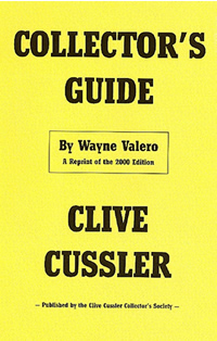 The "Collector's Guide To Clive Cussler" by Wayne Valero was a huge hit among collectors. After a couple of years, they were sold out and being listed on Ebay for hundreds of dollars each. We saw the demand was still strong, so the CCCS re-printed "Collector's Guide To Clive Cussler" with a yellow cover titled "Collector's Guide" indicating that it was a reprint of the year 2000 edition. Signed by Wayne Valero, Clive Cussler and Paul Kemprecos. 8.25"x5.5" trade paperback. 262 pages. $50.00 includes media mail shipping in the US. All un-signed copies are sold out.