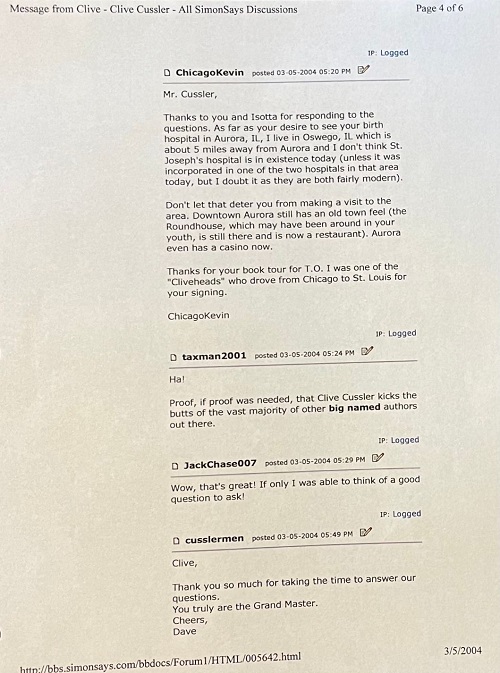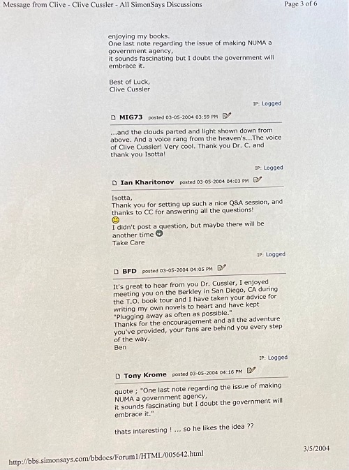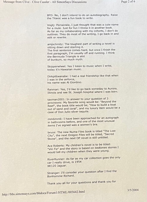 Some of those asking the questions have passed away over the years. Reading Cussler's answers makes me appreciate that I happened to print out this little tidbit of history. The SimonSays board is long gone and this interaction with his fans makes us all realize how special Clive Cussler was to all of us.